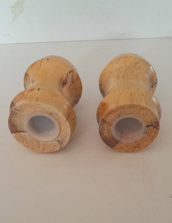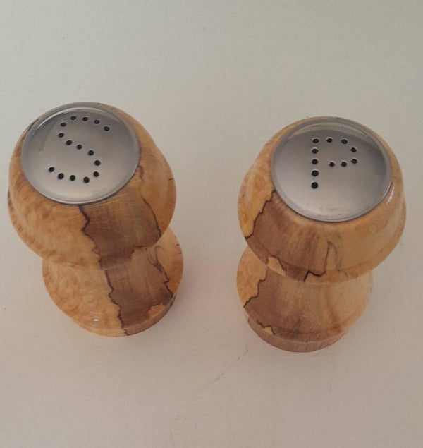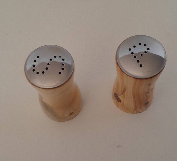 Duo salière et poivrière chromé corp en bois de hêtre,bouleau échauffé,platane et genévrier pour les grands hauteur 10 cm diamètre 6 cm pour les petits hauteur 8 cm diamètre 4 cm