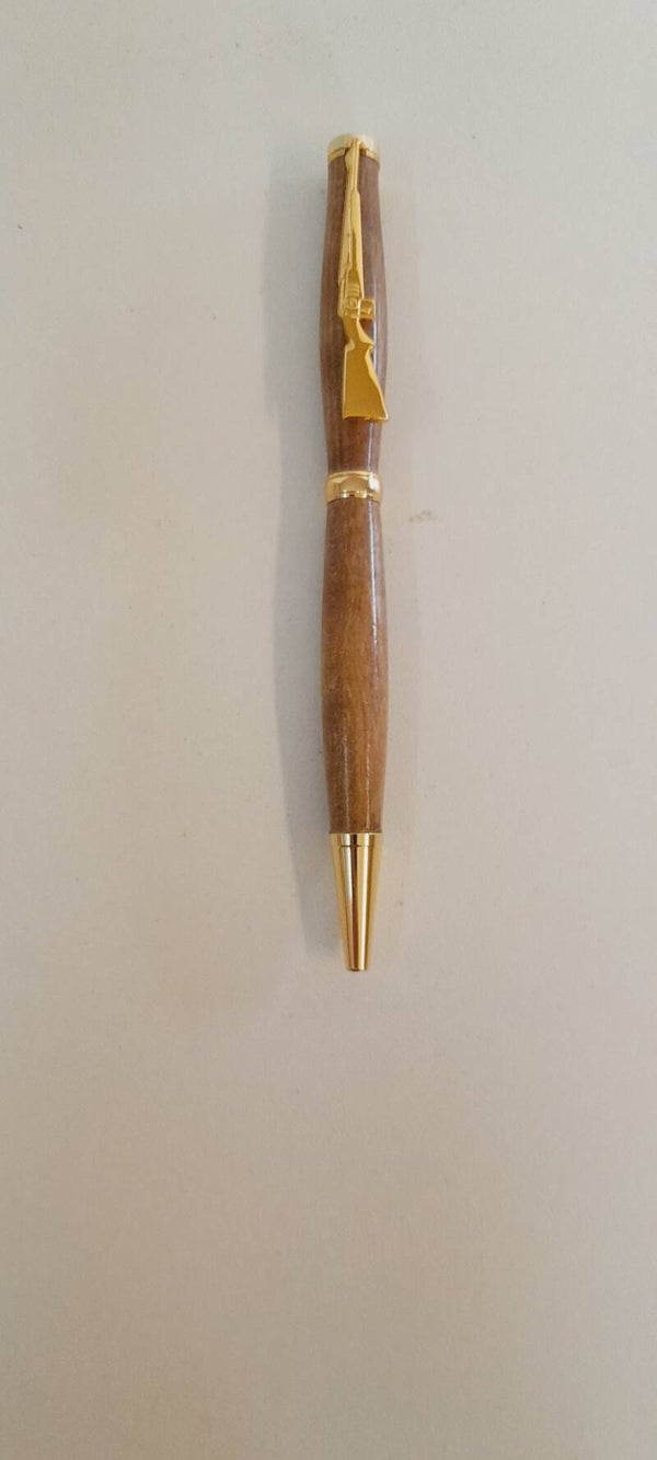 Stylo bille avec épingle fusil . Ce stylo plaira à tous les amateurs de chasse et passionné de tir , mécanisme doré, bois de chêne ,couleur encre noire (possibilité de mettre une gravure , nom ou divers )